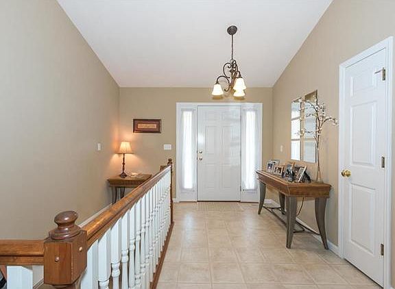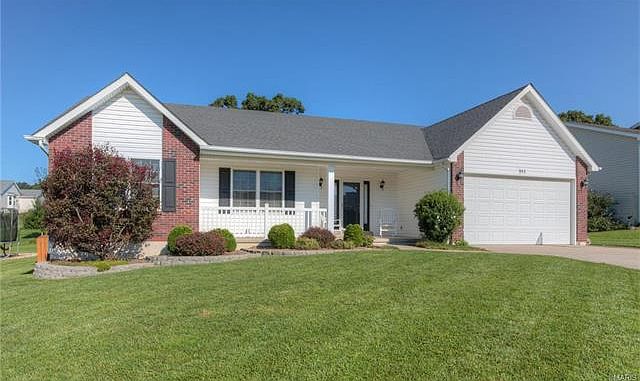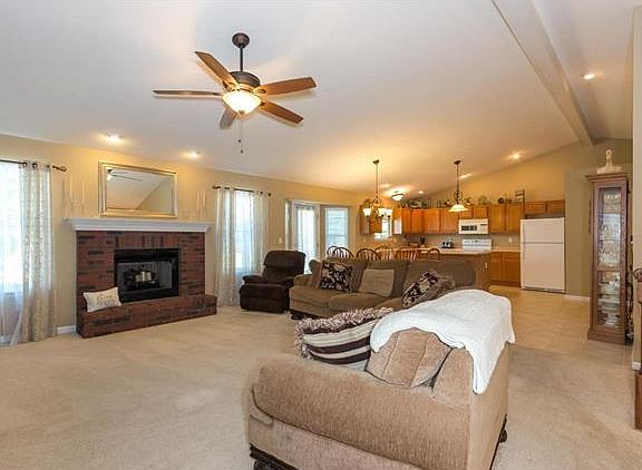 Spacious ranch home with open floor plan! Vaulted ceilings run through the main living areas and a there area a ton of windows for natural light. Living room with fireplace, brick surround, white mantel, and plant shelf. Kitchen and dining area is huge with plenty of cabinet space, center island, recessed lighting, main floor laundry off the kitchen. A bay window with French door opens to back patio off the dining area. Vaulted master bedroom suite with walk in closet, luxury bath with separate tub and shower, dual sinks, tile floor. Two additional main floor bedrooms and full bath off the hall. Open spindles to the lower level just waiting for your finishing touches! Great level fenced back yard with patio and above ground pool. Nicely landscaped front yard with covered front porch. Additional features include white six panel doors, ceiling fans in bedrooms, updated light fixtures, rough in bath in lower level, this home is 10 years young and move in ready!