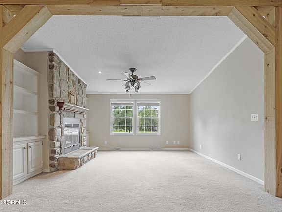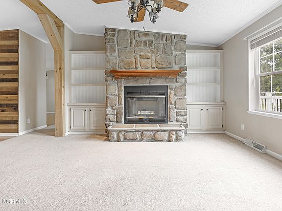 Nestled between hardwoods and pine trees, on 2.3 acres, you are greeted by a charming updated, split floor plan home. As you make your way to the front door you will notice the upgraded composite decking, before entering the living area. To the right of the living room, you will find your primary oasis with an updated ensuite, large walk-in closet with custom built in storage, and an extra space, perfect for a home office or study. Back out in the living area you will notice the formal dining room before making your way into the kitchen and den/sitting area where you are greeted by a shiplap accent wall, built- in cabinetry, and stone fireplace. Just past the kitchen you will find the remaining bedrooms and an additional bathroom. Make your way off the back covered deck you will notice the detached covered garage and the large, wired Woodshop with an enclosed space perfect for your lawn mower. Grab some chairs and enjoy the fire ring on cool fall evenings. You will also find tucked in the wood line an additional shed for storing your garden tools. Did I mention there is no HOA and no City Taxes. What are you waiting for, call today!