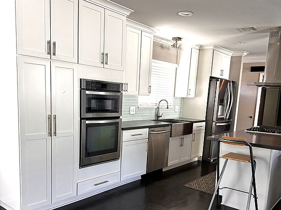 The home features laminate flooring throughout the main living areas, a cozy fireplace, and abundant natural light. The open layout flows seamlessly into the kitchen, which is appointed with white shaker cabinetry, granite countertops, an island cooktop, and a double oven, making it ideal for both everyday living and entertaining. A stylish barn door separates the main living space from the bedroom hallway, providing both functionality and privacy.