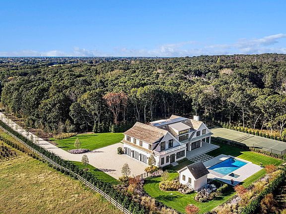 Sitting on nearly 5 private acres, this new construction is a classically-inspired masterpiece with farm views. The home, spanning 8 bedrooms and 10 full bathrooms, contains 9,460 +/- square feet of living space, including a 2,550 +/- square foot finished lower level. This home is the pinnacle of luxury, tucked away amid the farmsteads of Water Mill, yet conveniently located moments from the world's most sought after beaches, dining and leisure. Upon entering the residence, an entry gate with a long tree-lined driveway greets guests and homeowners. On the first level, the house has a natural bridge between the interior and exterior with the kitchen, breakfast room, living room and junior bedroom connected to a large outdoor patio. On the second level, there is a grand primary suite and 4 additional en suite bedrooms, each with custom walk-in closets, tray ceilings and well-appointed bathrooms. The finished lower level has a media room, recreation area, sauna, gym, third laundry room and 2 additional en suite bedrooms. Exterior amenities include a 20' x 50' heated gunite pool with auto cover with spa, pool house and Har-Tru tennis court.