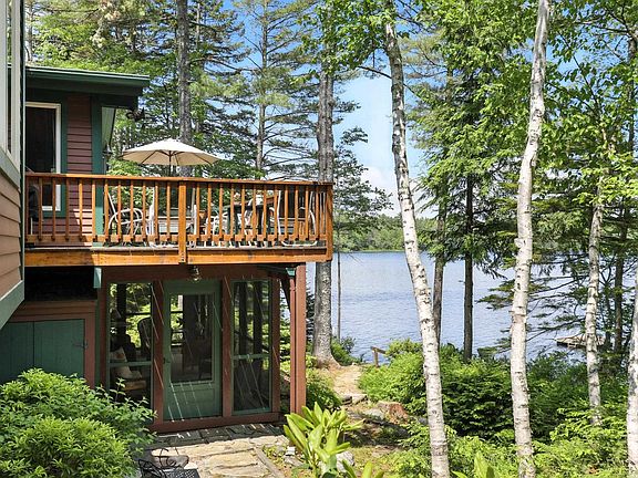Wonderful waterfront home located on Messer Pond consisting of 1.3 private acres and 300’+ of frontage. The setting is very private and has magnificent views overlooking the water. The original home was completely remodeled and expanded in 2001 by McGray & Nichols and in 2012 another major expansion was added. The design offers easy 1 floor living and additional living space in the walkout lower level. First floor: kitchen features quality cabinetry, breakfast bar, granite counters and tile backsplash. The dining room has a stone fireplace, vaulted ceiling and access through French doors to the deck. The primary bedroom is spacious, includes a ceiling fan and its bath has a tile shower, jetted tub, double vanity with granite counter top. The ½ bath has washer & dryer and living room has a propane fireplace, power shades and a custom built window seat with storage drawers. Lower level: consists of a family room with wet bar & refrigerator, propane stove and access to the screen porch. There is a full bath, ¾ bath, office with built in book cases, a crafts room with radiant floor heat and 2 guest bedrooms. The large windows allow for water views from almost all rooms. Other features include: generator, central AC, irrigation system, security alarm system, patio, fire pit, perennial & shrub gardens, aluminum dock, float raft, canoe/kayak storage rack and oversized 2 car garage with storage and possible expansion above.