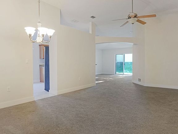 Welcome Home! Step through the covered entryway and into a bright, spacious hallway that sets the tone for this beautifully designed home. Just off the entry, you'll find a versatile room that has been converted into a comfortable fourth bedroom, perfect for guests, a home office, or a playroom. The home then opens up into a large living and dining area, ideal for both relaxing and entertaining. Continue on to the family room and fully equipped kitchen, which offers generous counter space, abundant cabinetry, and everything a home chef could need. The high vaulted ceilings create an open, airy atmosphere throughout these main living spaces. The primary suite features a spacious bedroom and an ensuite bathroom with a garden tub and separate showera perfect retreat after a long day.Outside, the fenced backyard is not enclosed but gives privacy that provides ample room for outdoor living and recreation, offering plenty of space to relax or play. Come see why this home is the perfect place to create lasting memories!