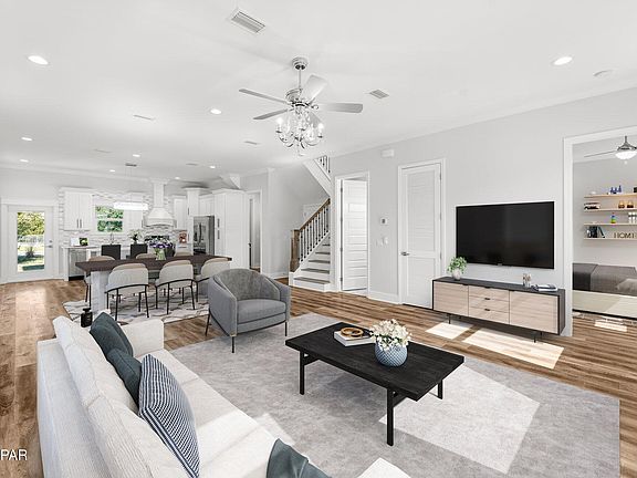 LOCATION, LOCATION, LOCATION! Discover this stunning brand-new, custom-built 4-bedroom, 2.5-bathroom home. Harrison's Walk Subdivision is located in a highly desirable, family-friendly neighborhood. 1 block to Shipwreck Island Waterpark, 2 blocks to M.B. Miller County Pier, The Beach, Just Jump Trampoline Park, Local Restaurants, Sequence Fitness Centers, Starbucks, Lowes and a quick drive to Pier Park for endless shopping, dining, and entertainment. This beautiful home was designed with 10-foot ceilings, 8-foot doors, and large hurricane-rated windows, flooding every room with natural light. The open-concept floor plan makes it ideal for entertaining, seamlessly connecting the kitchen, dining, and living areas. The First Floor Features the master bedroom with a spacious walk-in closet and a luxurious en-suite bathroom featuring a double vanity and a stunning marble-tiled walk-in shower. The Kitchen is modern, functional design that flows into the living/dining areas with a guest- friendly half bath. Conveniently located off the kitchen is a large sized laundry and Extra Storage hidden space under the stairs for added convenience. Upstairs includes 3 Spacious bedrooms with lots of natural light and one offering a private balcony to enjoy serene neighborhood views. The upstairs bathroom features a double vanity, a soaking tub, and a marble-tiled shower, offering a spa-like retreat. The backyard has a nice covered patio perfect for grilling and unwinding after a day at the beach. The front porch is a cozy spot to relax while the kids play or bike to the community pool. There are Two HVAC Units for optimal comfort year-round and a tankless gas water heater for endless hot water after a long day. This home is a must-see! Schedule your tour today and experience the perfect blend of coastal living, modern design, and everyday convenience in the heart of Harrison's Walk.