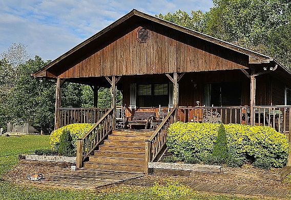 Cabin style 3 brm 2 bath home with wrap around porch front to back. Shooting Creek behind home. Long Mountain View for 120 Deg. from front porch. 1 Acre of 100% usable land. Large shed workshop. Furnished, less some pieces and personal items. Harley Theme in home. Gas log stone fireplace. Open Floor Plan! Priced right for a quick sale. FIBER will be available in 6 months.