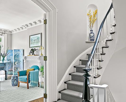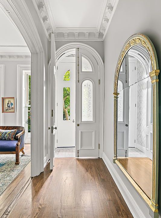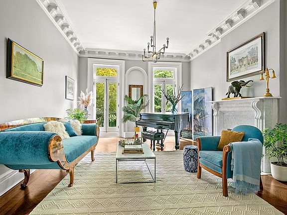 The parlor floor is classic and regal, with newly restored and refinished parquet floors and original moldings. French doors open to a stunning rear parlor with a custom-imported Italian marble mantel and matching floor-to-ceiling Juliet balcony doors. The front parlor provides a grand sense of arrival and offers a formal library for quiet contemplation or a secluded work-from-home opportunity.