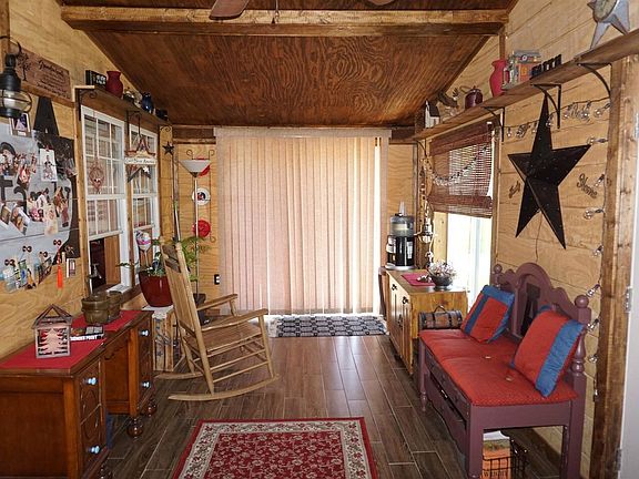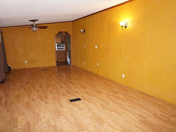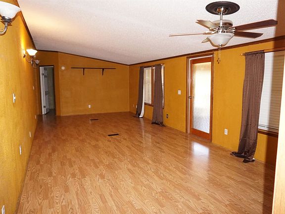 Well constructed double wide on permanent foundation. 250 square foot FL room (bonus room) on the front not shown on tax square feet. Great room, 2 split bedrooms, with office that could be used as 3rd bedroom., 2 and 1/2 bath. Crown molding, pass-thru from large country kitchen to den with wood burning fireplace. Metal roof, Screen porch, RV pad with water and electric and more. Private with woods in the back. Lots of rooms/space with flexible uses. Detitle complete, no delays to close.