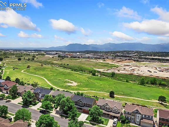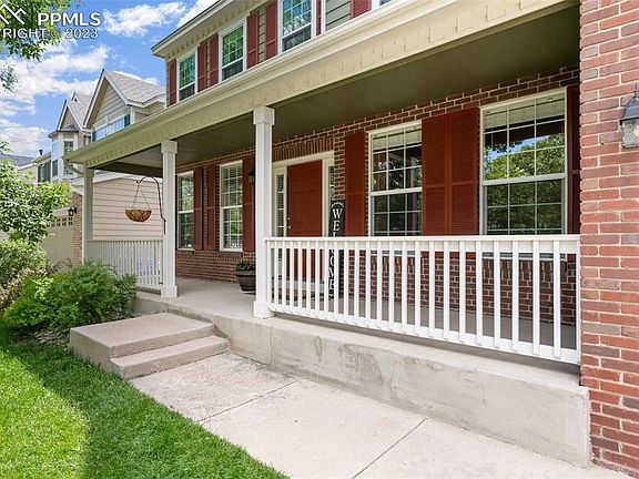 ** Welcome home to sweeping Pikes Peak views! This lovely home has unobstructed mountain views and dedicated green space behind it with a large backyard and expansive deck/pergola to be able to sit and enjoy the views. ** Covered front porch ** Grand entry with sweeping staircase ** Furnace replaced in 2019 ** Carpet replaced upstairs in 2022 ** Oak wood floors refinished and sealed ** Open great room concept has a large kitchen w/ island and breakfast bar seating, granite counters, tile backsplash, gas range, and stainless steel appliances included ** Gas fireplace with stone surround ** Built-in bookcase shelves with accent lighting ** Main level office ** Spacious primary suite on upper level w/ large 5 pc bath and huge walk-in closet ** Additional living space in the basement with a family room, 2 more bedrooms (1 non-conforming), and a 3/4 bath. ** This is one not to be missed!