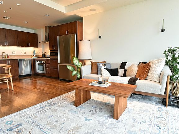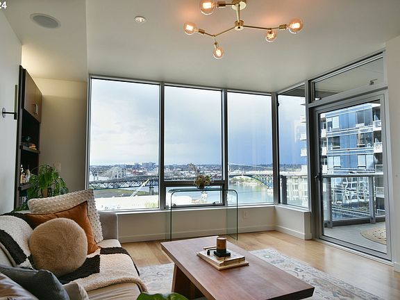 Experience urban living at its finest in this stunning South Waterfront condo, perched on the 15th floor. Every room features spectacular views of the river, city skyline, and the scenic NW mountains. This modern 1-bedroom, 1-bathroom condo boasts an open layout that spills onto a covered balcony, perfect for enjoying the scenery. The well-designed kitchen features stainless steel appliances, a gas cooktop, ample counter space, and plenty of storage. In the bedroom, you'll find a built-out walk-in closet and remote-controlled powered blinds. The home boasts thoughtful details such as a custom-built cabinet, new wall shelves, fresh paint, and updated light fixtures throughout. Practical amenities include in-unit storage space, air conditioning, washer and dryer, a shower/tub combination, and wired connectivity for a home theatre setup, along with upgraded fixtures in the bathroom and kitchen. This residence includes a deeded parking space, and the parking garage offers community storage for bikes, kayaks, and paddleboards. Relax in the residence lounge, ideal for entertaining or unwinding. Embrace the vibrant urban lifestyle with shopping, dining, and coffee options at your doorstep. Stay connected with easy access to the freeway, streetcar, OHSU, tram, Gibbs footbridge, and access to the east side via the Tillicum Bridge. Enjoy fresh produce and artisan goods at the nearby farmers market, and take advantage of the proximity to parks and waterfront outdoor recreation. With breathtaking views of Mt. St. Helens and Mt. Hood, this condo offers more than just a home-it captures the essence of the Northwest. Don't miss your chance to experience luxury, convenience, and unparalleled views in Portland's South Waterfront