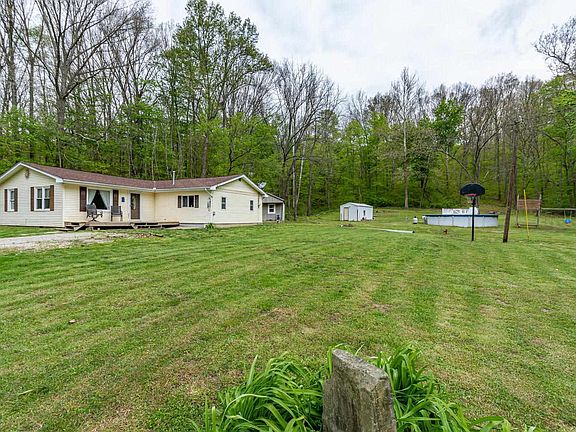 This home is a must see almost 6 acres nice yard and woods within the last five years home has had new roof, gas forced air furnace, and central air, hot water heater,kitchen redone new cabinets,counter tops and appliances,new flooring thru the whole house,bathroom redone new fixtures,and cabinets,new windows,drywall and paint, insulation added. Home has a nice wood porch on the front of the house to sit on and just enjoy the peace and quite. There is a finished shed, chicken coop and 24x24 foot pool with a pool deck which stay with the home. Unique landscaping