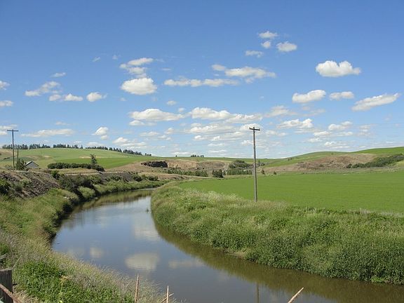 Great opportunity for mini farm across from Hangman creek, Farmhouse surrounded by beautiful Palouse countryside. Vinyl siding, heat pump, several wells, large outbuildings with stalls for livestock, horses, pigs, rabbits etc. Wood stove/fireplace, lots of room for storage. Several 200 amp service panels for mfg. home or another Shop.