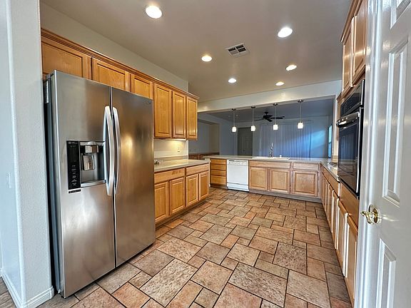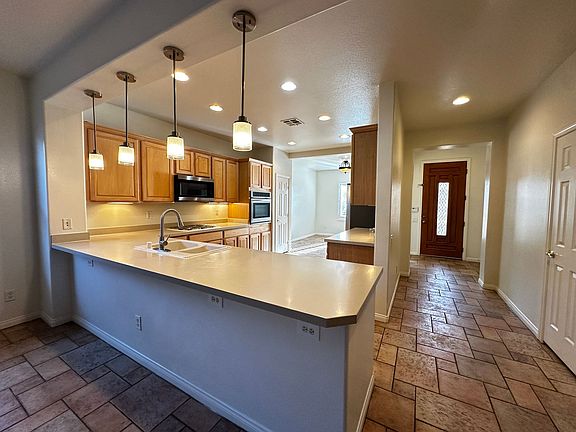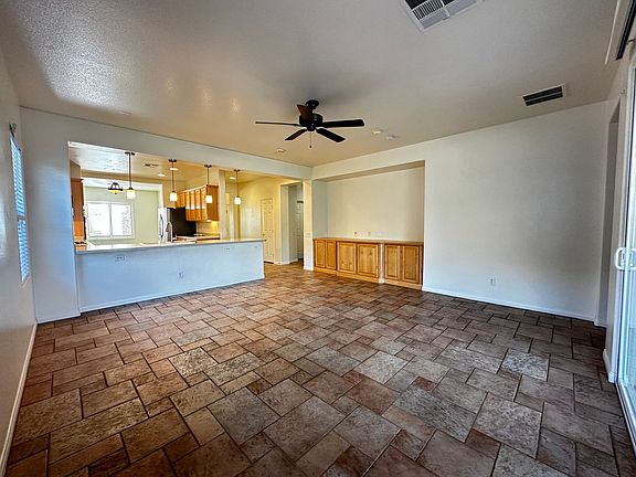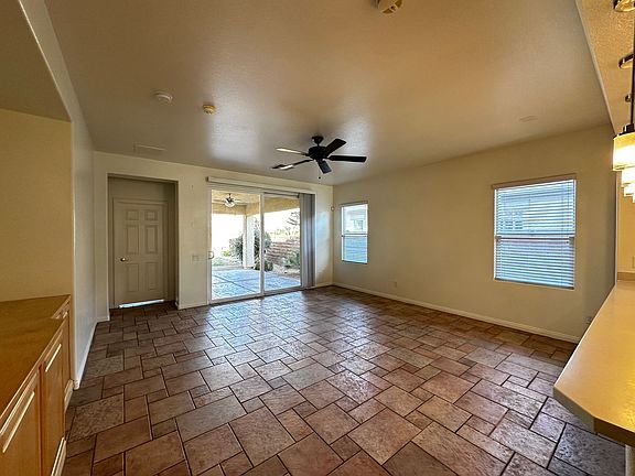 Beautiful single story with custom tile and open floor plan IN SUMMERLIN!!. Plantation shutters in the home, ceiling fans through out. this home has surround sound system pre-wire custom entertainment unit. Primary bedroom has retreat with custom built in book shelf and plantation shutters. Move-in ready. New paint, new vinyl, and wall coverings through out, covered patio with ceiling fan. Well kept house and appliances. **NO CARPET**