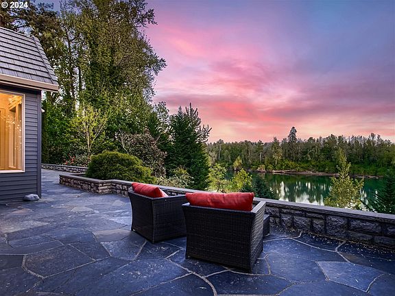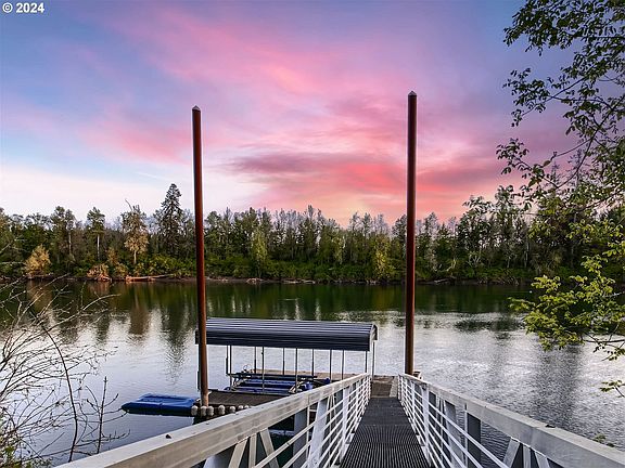 Welcome to this stunning, gated riverfront estate! Opposite Champoeg State Park, this home offers unparalleled views of river, wildlife, and sunsets. Featuring a main level primary suite, two bedrooms upstairs, all with high ceilings and stunning views, plus a finished 250 bottle wine cellar. The detached garage has 4 bays plus a 5th large enough for a Class A Motorhome. The upper level of the garage boasts a guest suite with full bath, private deck, and kitchen. Enjoy no stairs to your covered dock with 6600lb boat lift and PWC dock. The 2,100 square foot patio is ready for lavish gatherings, complete with fireplace and breathtaking views. A home that must be seen to be believed, schedule your tour now!