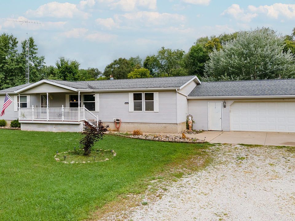 Charming 3 bedroom, 2 bath home located on almost 9 acres of land. Great layout on this split ranch large great room with fieldstone gas fireplace, master suite with walk in closet and attached bathroom with soaking tub and walk in shower. Two additional bedrooms, each with walk in closets, on the other side of the home with another full bathroom. Two and a half car garage and additional oversized shed offers tons of storage. Large partially finished basement is great for storage and has two rooms walled off. The basement has a corn burner to supplement propane. Relax on the large back deck overlooking your private backyard and enjoy nature. The house is situated on the front part of the lot. Across the creek the property opens onto the field which offers great space to hunt or farm.