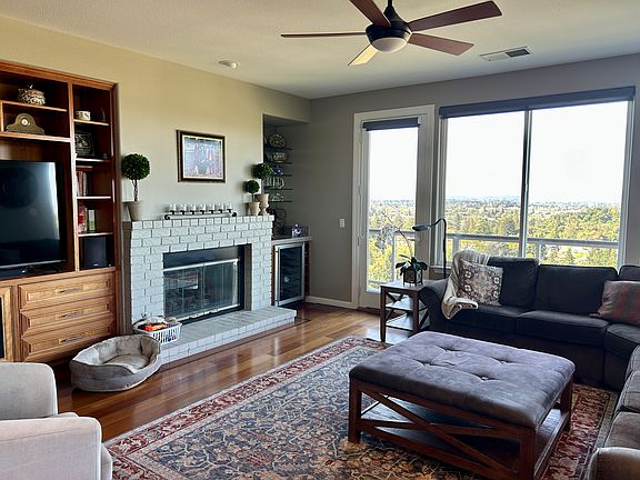 Spectacular panoramic views from this hilltop estate in a coveted Fountaingrove neighborhood with custom homes. This grand home rises up to meet you and is located on a quiet, private street. The home lives like a single level and features four bedrooms, two of which are master suites, one being on the main floor. In addition to the bedrooms, there are three bathrooms and an additional den/living space on the lower level. As you enter the home, you are immediately greeted with a wall of windows which showcase the stellar view. The home has gleaming cherry wood floors and offers both a formal living space, family room and formal dining room with french doors leading to the peaceful outdoor patio. A gourmet kitchen is perfectly situated in the home for entertaining and features a gas range, stainless appliances and granite countertops. The main level spacious master suite has a dual sided fireplace, more windows to let in the light and the views and a luxurious master bathroom with large soaking tub, frameless glass shower, heated floors and two closets. Downstairs you will find three additional bedrooms. Two of the bedrooms share a large bathroom with dual sinks and the third bedroom has a recently remodeled gorgeous bathroom with a grand shower and an incredible walk in closet. This bedroom also offers a private balcony/deck. There is a full laundry room with ample cabinetry and counter space, three car garage and additional storage room. Outside space includes multiple decks, a quiet courtyard surrounded by oaks and a rock waterfall. Rounding out the special features of the home are solar panels for lower energy bills and dual controlled A/C. Must have minimum credit score of 680, income of 2.5 times the rent and good rental history to qualify. One cat or one small dog may be considered. Rent includes landscaper. Can be rented furnished.