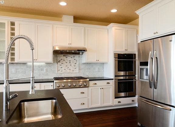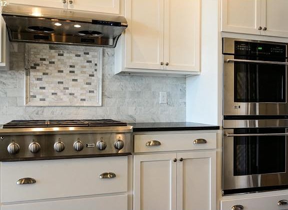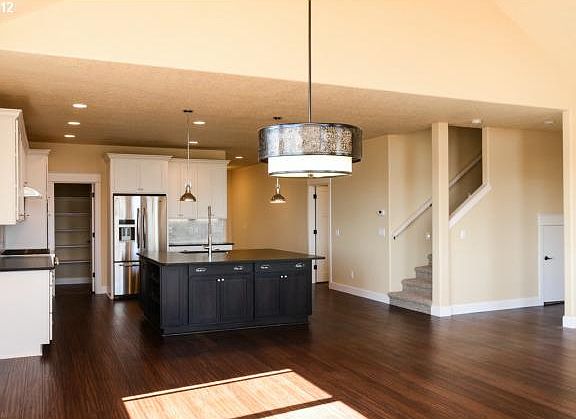 Top of the the line Kitchen with White Cabinets and an Ebony stained Island,Wine Rack,Spice Racks,etc Granite,Subway tile backsplash,high end appliances with Built in Hood,Hardwood Flooring,Open Rail,Rubbed Bronze Lighting and Hardware,Extensive Covered Deck with spacious Rear Yard.