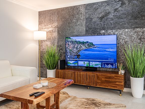 Living Room: White leather sofa, solid acacia furniture, and a Samsung Q90 TV (top-rated model).