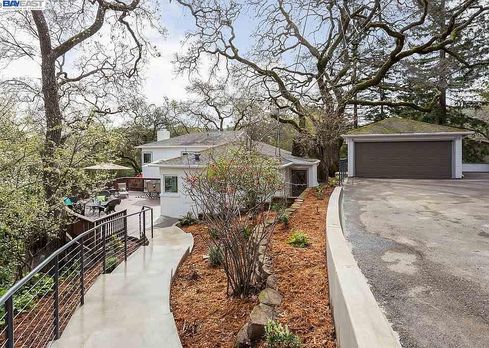 This beautiful home sits on a private key lot under under a oak canopy with fabulous Diablo views close to town and BART. The 2 bedroom 2 bath home has been updated throughout . The bright open kitchen & dining area were just remodeled.Kitchen features a vintage Wedgwood stove, butcher block island & opens to expansive deck for open air living at its best. Many indoor & outdoor living spaces make this home very unique. The upstairs features 2 bedrooms .The lower level is set up as a master bedroom retreat " No closet" or could be a large family-room. The outdoors feature's a terraced walkway, custom railing meandering through terraced gardens leading to the outdoor living area. Two sunny decks and meandering path leads to tranquil spaces.The garden features a spa, sunny lounge area , lawn, dinning area,chicken coop & storage.Large 2 car garage has a hidden art/yoga space & laundry area. There is a wine cellar under house.Bart & freeway access. Chandelier does not stay. Open 3/25 1-4.