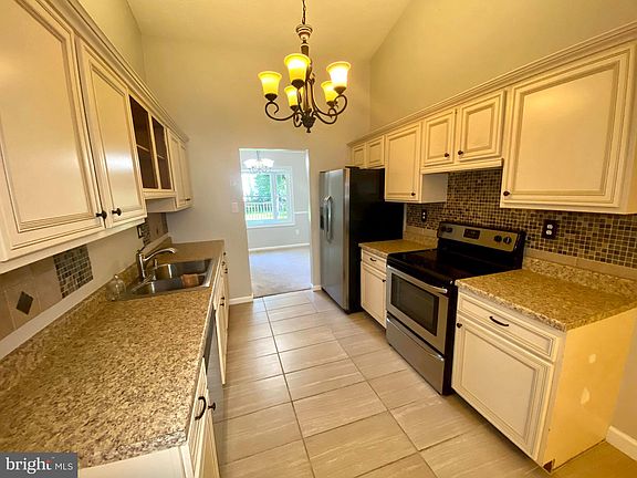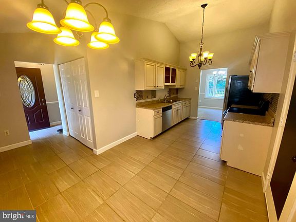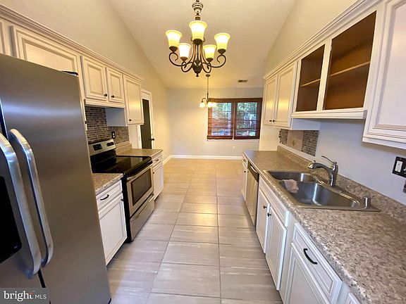Cathedral ceilings make this home feel very spacious. Move-in ready. Large kitchen with lots of counter space. Table space is ample. Granite counters and stainless steel appliances. Plenty of cabinet space. The dining room is a good size and has a bay window which adds lots of light. The living room is large and also has a bar area for entertaining. The french doors in the living room lead to the large deck with plenty of space for all activities (deck will be painted and couple loose boards repaired or replaced). The rear yard is fenced. This master bedroom is also spacious and has the half bath and walk-in closet. There are two additional bedrooms with plenty of closet space. The garage has enough space for your car/motorcycle and work bench or storage. The garage door will be replaced. The front of the home has a porch with space for plants, chairs, etc. This home is close to several commuter routes as well as shopping. Welcome!