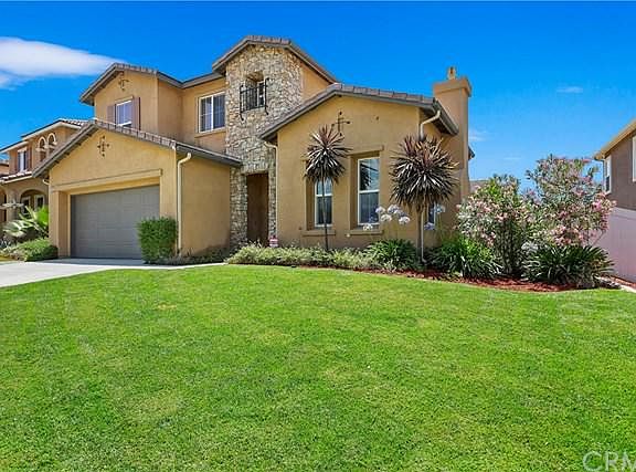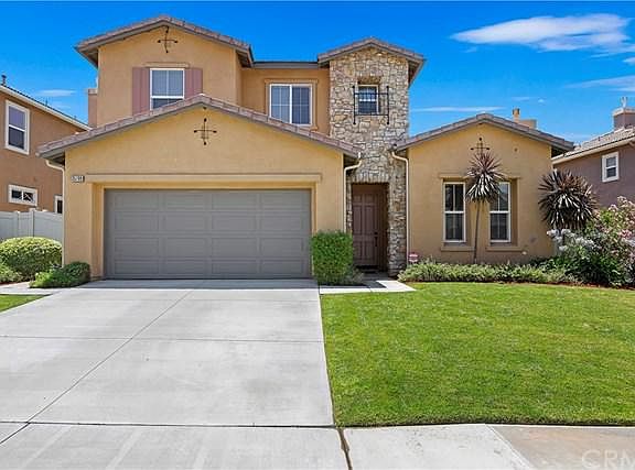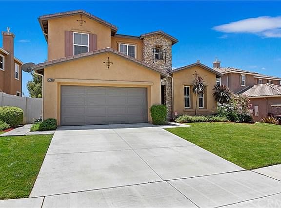 Don't miss this beautiful 5 BR, 3 bath home with golf course & canyon views! Offering a gourmet kitchen with white quartz counter-tops, decorative back-splash, white cabinetry, stainless steel appliances, food pantry, custom Modern-Aire hood and butcher-block-top extended island/breakfast bar. This gem includes upgraded wood laminate flooring throughout the main living area, a dual-sided fireplace between family & dining rooms, formal living room with custom mantle over the fireplace. The spacious master bedroom has a balcony, walk-in closet, master bathroom with Roman tub, separate shower and dual sinks. This floor-plan offers a large bonus room/loft - perfect game room! This home includes nicely landscaped front & back yards, a quaint courtyard/patio between the kitchen & dining room (with French door access from both) and a covered patio off the family room (stamped concrete on both), overlooking a PGA golf course that winds through a naturally scenic landscape! Other features: 3-car tandem garage, monitored security system, high ceilings, 8-thick walls, ceiling fans, stone fascia accents, rain gutters, tile roof and more! Community features: 2 swimming pools, playgrounds, baseball diamonds, basketball courts, work-out gym, clubhouse (to rent/reserve for parties) & WiFi! Near the new Stater Brothers and Nicklaus Park, with fitness stations, dog park, tot lot & playground with merry-go-round, multi-use game area with hopscotch, wall-ball, four-square & pickle-ball courts.