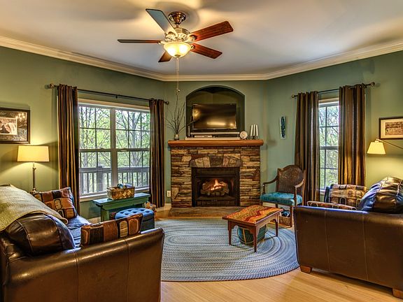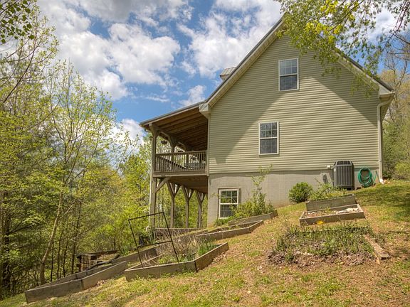 Perched on a hill, this traditional home has lovely winter views and feels like you are living in a tree house in the summer. The covered front porch overlooks the mountains and the raised garden beds. Inside you'll find 9 foot ceilings and beautiful crown molding. The open floor plan has a large kitchen with dining area and living room with stone fireplace. The spacious master suite has a custom closet, soaking tub with separate shower and doors that lead on to the covered porch. The second floor has 2 large bedrooms with a hall bath and a small loft area with custom shelving that would make a nice reading area. The lower level has a garage area, family/craft room with sink and an area perfect for guests that includes kitchen area, den, bonus room and full bath. The guest space has an exterior entrance and owners have rented this in the past. This sunny lot is convenient to Boone with good access and well-maintained roads.