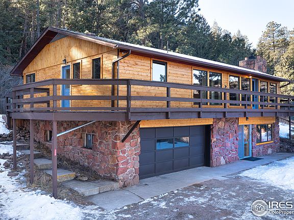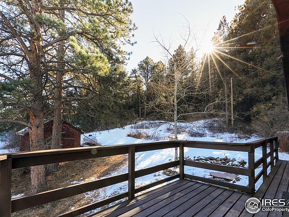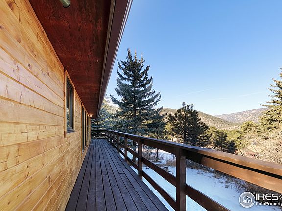 This beautiful, remodeled walkout ranch has spectacular views of Moose mountain and is located in a private nature setting in a wonderful mountain community with easy year round access. Only a 9-minute commute to Lyons, a 1/2 hour to Boulder and Longmont and 20 minutes to Estes Park. New Pella metal clad windows, Therma-tru doors, new solid oak hardwood floors and Saltillo tile are throughout the house. The beautiful flagstone fireplace has a new high end, efficient Regency wood burning insert and is surrounded by new tongue and groove pine walls. Electric and plumbing updates have been done along with the installation of a new forced air furnace. Two of the main floor bedrooms walk out to a large flagstone south facing patio surrounded by flowering perennials, lilacs and aspen. The recently finished walkout basement includes a spacious bedroom, family room, a 3/4 bath and large walk-in closet. The attached oversized 2 car garage is fully finished, insulated and heated with the new forced air furnace. New tongue and groove pine siding and the flagstone exterior give the house a great cabin feel. This house is insulated and keeps the entire house warm in the winter and cool in the summer. The spacious 280 sf barn has electricity, a wood plank floor and could be used as an additional workshop. A Craftsman riding mower comes with the property. Also included is a generator which will operate the furnace and refrigerator if ever needed. Come sit on the deck and enjoy the mountain views and abundant wildlife.