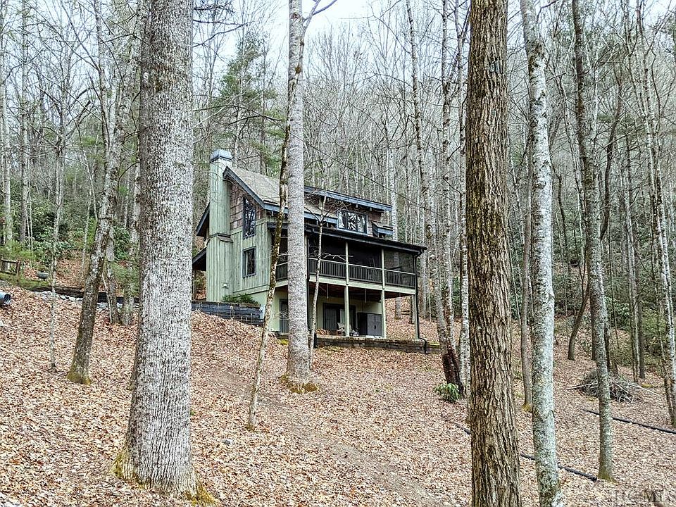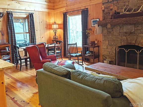 This cozy cabin located minutes from Cashiers and Lake Glenville sits on 1.61 acres in a private well maintained neighborhood with newly paved access. Cathedral exposed beam ceilings; pine paneling, twig railings and pine floors offer a tasteful yet rustic feel to this home. Beautiful Stonework on the wood burning fireplace topped with a natural hardwood mantel. Well decorated, furnishings and custom made window coverings included. (few exceptions) Granite counters, recessed lighting and modern stainless steel appliances featured in the open chefs kitchen. Natural slab Granite Island boasts a double sink and dishwasher with stools for dining. Lots of closet space! Open air lofted suite with walk-in closet, private bath, pedestal sink and shower. Charming covered entry porch and screened porch offers additional seasonal living and dining space. The home features a Lower level suite with separate living area, bedroom and bath, double granite vanity, shower, and walk-out concrete patio. Beautiful bark accents featured on this home's board and batten exterior.