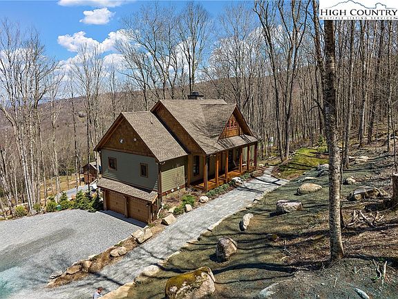Welcome to Altitude Adjustment, a fully furnished custom crafted luxury retreat perfectly situated within the prestigious Lodges at Eagles Nest. Resting on more than two acres of pristine mountain land, this home captures the essence of High Country living while offering refined finishes and a design that embraces both comfort and elegance. From the moment you arrive, the attention to detail and thoughtfulness of the build are clear, from the handcrafted rock wall framing the driveway to the sweeping layered long range views that surround the property. Inside, soaring tongue and groove cathedral ceilings, warm hardwood floors, and walls of glass sliders create a light filled interior that blends seamlessly with the natural surroundings. The open concept floor plan was designed for gathering, with the great room, kitchen, and dining areas flowing together in harmony. At the heart of the main living space, a floor to ceiling stone fireplace serves as both a dramatic focal point and a cozy centerpiece for cool mountain evenings. The kitchen is a dream for both daily living and entertaining with a deep farmhouse sink, stainless steel appliances, and a large prep island with seating that provide convenience and function while the thoughtful design allows for effortless hosting. The primary suite is located on the main level and offers a sanctuary of privacy and comfort, with oversized glass sliders opening directly to the outdoor living area, a spacious walk in closet with custom built shelving, and a spa inspired ensuite bath featuring a walk in glass shower. An additional guest suite with private bath is also located on the main level, while the laundry room was designed with mountain living in mind offering granite countertops, a prep sink, and custom cabinetry that add both function and style. The finished lower level is a haven for entertainment and relaxation with expansive windows and sliding doors connecting the interior with the outdoors, a living room for gatherings, a bunk room with built in beds that sleeps four, an additional guest bedroom, and a beautifully appointed Jack and Jill bath. Outdoor living is one of the greatest highlights of Altitude Adjustment, with an expansive open air porch to savor the crisp mountain air, a covered lower patio with a porch swing and hot tub, and a six person fire pit crafted from locally sourced stone where memories are made against a backdrop of mountain views. The landscaping enhances the natural beauty with thoughtful detail from the rock wall accents to the generous parking area and two car garage. Every element of this property was designed to create not just a home but an experience, where mornings begin with coffee on the porch as the mountains stretch into the horizon, afternoons are spent exploring the countless activities offered within Eagles Nest, and evenings end with loved ones gathered by the fire or soaking in the hot tub. The Lodges at Eagles Nest is one of the most sought after communities in North Carolina, celebrated for its combination of luxury, adventure, and natural beauty, offering amenities such as hiking and ATV trails, sports courts, community pavilions, and local events. Altitude Adjustment is more than a home, it is a destination that embodies rustic elegance, modern comforts, privacy, and connection to the natural world, whether chosen as a full time residence, a vacation home, or an investment property, this retreat offers the very best of High Country living.
