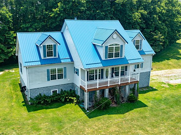 A gravel drive leads through pastures to the large, attractive home with an eye-catching blue metal roof. Entry is through the lower-level garage. The expansive open-plan great room incorporates the living, kitchen, and dining areas and offers ready access to the covered porch and back deck.