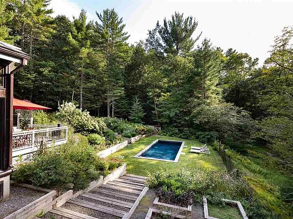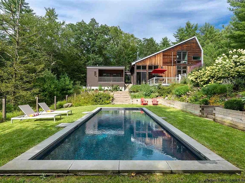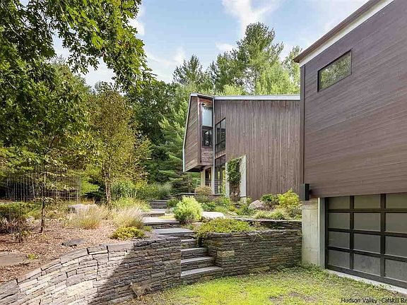Enjoy privacy and views of nature through walls of glass in this architect-designed gem on a quiet country road in Olivebridge. The wide open living space is generously proportioned to accommodate large gatherings, yet maintains warmth and intimacy through the use of rich natural materials, including Spanish stone tile floors and warm woods. First floor primary suite includes a large walk-in closet, spa-chic bathroom, and a balcony which overlooks the 20 x 40 heated saline gunite pool. Two bedrooms on the upper level share another great bathroom as well as a sitting area. The finished lower level, which provides access to the two-car garage, includes two finished rooms, one of which is currently set up as a fourth bedroom, while the other is a play room for the owners' two young children. Efficiency was top of mind when this home was designed, with multi-zone radiant heat and mini-splits for air conditioning. The grounds are beautifully landscaped (with a sprinkler system), there's an outdoor shower, and the Rochester Creek meanders through the front of the property. Nearby attractions include Inness, Westwind Orchard, Arrowood Brewery, Mohonk Preserve, Minnewaska State Park, the Ashokan Reservoir, funky High Falls and vibrant Kingston.