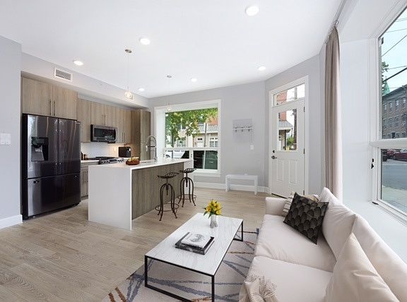 Prepare to be stunned! Welcome to this gorgeous two bedroom, one and a half bath unit in an ideal location. Step into your modern kitchen with black stainless steel appliances, beautiful island with seating, and quartz countertops and whip up that signature dish. Enjoy the spacious open layout with large windows for gleaming natural light, wood flooring, recessed lighting, and central air. Nestled in a sought after neighborhood, just a short distance from restaurants, shops and cafes. This one has all you need and more. Don't miss out!