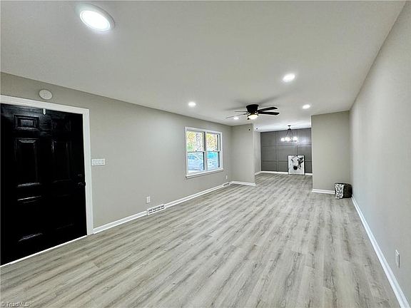 Impressive brick ranch on 1/2+ acre. Near 421 & 74, minutes from medical, entertainment & all luxuries the Triad offers. Features include: attached 2 car garage, fenced backyard featuring multi-level entertainment spaces, new floors & fresh paint throughout. Main level invites you into a light-filled living room with sightlines to formal dining- featuring a bold accent wall & chandelier. The stone infused kitchen offers new stainless appliances, island, pantry & a timeless subway backsplash making this kitchen practical & beautiful. A second livingroom has a fireplace & deck access. Down the hall, a bath, 2 guest rooms & a primary suite which boasts a big closet + ensuite bath w/ quartz counters & a herringbone-tiled shower. Lower level = ultimate entertainment hub: Sliders to the back patio, a wet bar, and a statement fireplace. 2 bedrooms w/ closets offer flex. Lower level includes: massive bathroom w/ 2 sinks, W&D hookups, and an unfinished space for storage or future customization!