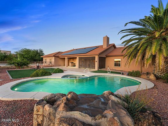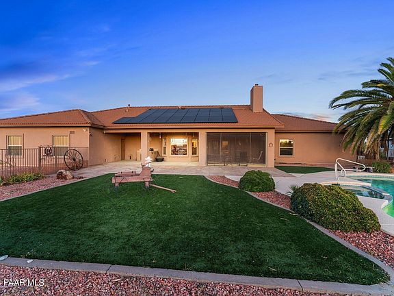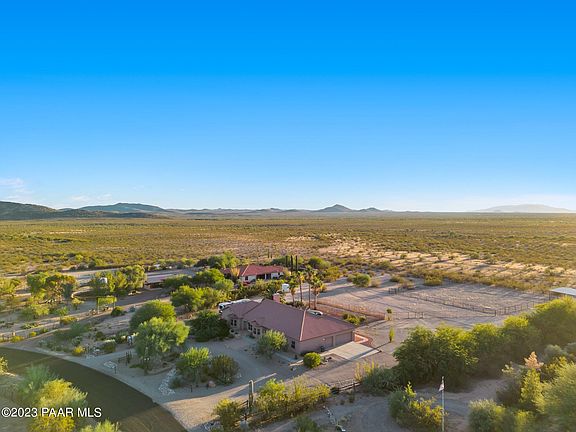This spacious 2810+ sq ft home is located on 2.5 acres that backs up to State Land. Located in Vista Royale with county maintained paved roads. This lot is located in Phase 2, and is one of the furthest lots from Hwy 93. The resort-like fenced back yard has a spacious covered patio and pool for plenty of AZ outdoor time. Pool is plumbed for both solar and propane heat. Horse facilities include 2-stall mare motel, hay storage, and a tack room. There is a separate fenced, irrigated area to grow grass for horses, or dog run. Approximately 1/3 of an acre is fenced with no climb for a horse turn-out, but plenty of flat useable land available to add an arena. Easy backyard access to State Land for miles and miles of riding. Property also includes full RV hookup, and owned solar panels.