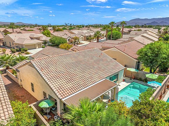 55+ Sun City Palm Desert--Highly sought after great room St. Croix model with 2 bedrooms, 2 bathrooms, DEN/OFFICE/HOBBY room. The resort-like rear yard features a newer gorgeous refreshing salt water POOL (2019) with stone accent wall, spacious patio with Alumawood awning, perfect for relaxing with a good book and also entertaining for the holidays. Located close to the Lake View Recreation Center with Club Med-like pool/spa and state-of-the-art fitness center. Super nice curb appeal, gated front courtyard with patio to enjoy your morning coffee. NEW HVAC (2022). Inside, plantation shutters t/o. The kitchen has brand new gorgeous white quartz counters, and the main counter is flat with a contemporary feel. Cabinets have been refaced with white doors, tile backsplash, gas cooktop, newer appliances. The living room is open to the dining area and kitchen and has sliding door to the patio. The master suite is spacious and has door out to the patio and pool deck, carpet, fan/light, custom closet system, bath has double vanity, painted cabinets, a stall shower, upgraded light fixture. The guest bedroom has mirrored closet doors, bath has cultured marble counters, shower/tub combo. Off the main hallway the den/office and a pocket door that leads to the hobby room. The laundry room has cabinets, and washer and dryer are included. The extended 2 car + golf cart garage has built-in storage. Low maintenance landscaping and artificial turf too.