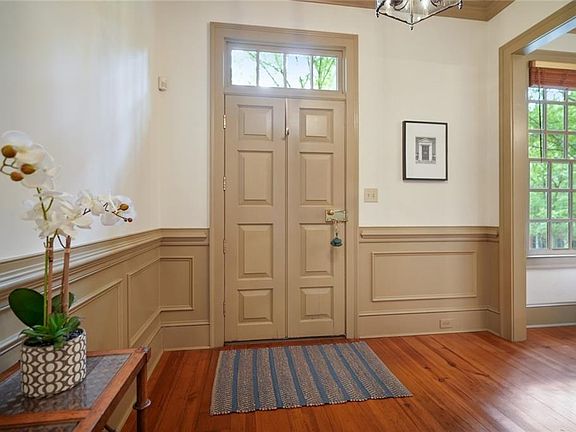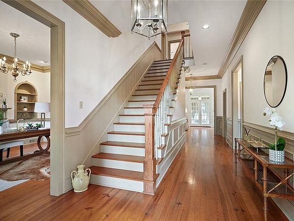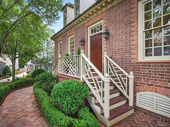 Enchanting Williamsburg-inspired custom-built home in the HEART of Vinings with primary suite on the main, main level garage, finished lower level, unbelievable storage, and walking distance to Vinings Jubilee's amazing restaurants, coffee shops, and shopping! This CHARMING William T. Baker designed home was inspired by Williamsburg's George Wythe House and the Red Lion Tavern and features wide heart of pine flooring, intricate moldings, and high ceilings throughout (10' on main and 9' up and down.) The wide foyer and grand staircase welcomes you into a handsome formal living room (or office) on the left with decorative fireplace flanked by arched built-ins. The living room flows nicely into a banquet-size dining room which continues on into the kitchen, or over to the family room. Great flow for entertaining! The spacious kitchen is ready for your personal touches and has both an island with countertop seating plus a large breakfast room framed by beautiful windows. Kitchen has views into the adjacent stunning fireside family room, flooded with natural light and views to the back garden. Great candidate for one-level living with the primary bedroom suite, laundry room, and 2-car garage all on the main. The covered porch off the kitchen and family room is the perfect shaded spot for al fresco dining or an evening cocktail and leads into one of the many gorgeous garden areas throughout the property! The upstairs offers endless opportunities with three large bedrooms and a full bathroom off a gracious wrap around landing, plus a huge unfinished room with rear steps down to the garage - potentially finish as an in-law suite, caretaker suite, home office, etc! The basement is airy and inviting with high ceilings, full-sized windows, den with ventless fireplace, bonus room (great for billiards or games) with an exterior entry door, bedroom, full bathroom, and abundant storage. Well-maintained and with newer systems (3 of the 4 HVAC components are 2018 or newer; tankless water heater is 2014). Highly sought-after community close to the Chattahoochee River, I-75, and the Braves stadium/Battery. LOW Cobb taxes too!!!