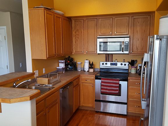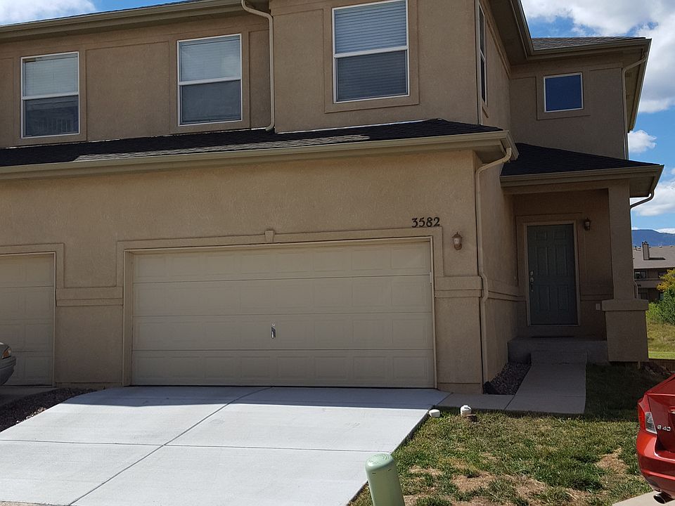 Spacious 4 beds, 4 baths & 2 car garage end unit. Hardwood entry, open floor plan w/vaulted ceiling & lots of natural light. Living rm walks out to deck & spectacular views of mtns & Pikes Peak. Living & dining rms share 3 sided fireplace. Kitchen w/hardwood, lots of counter space & stainless appls. Up has large master bdrm, 5 pc bath, his & hers walkin closets, laundry, full bath & 2 bdrms. W/out basement family rm, full bath, 4th bdrm. Close to everything-golf course, park, shopping, schools & military bases.