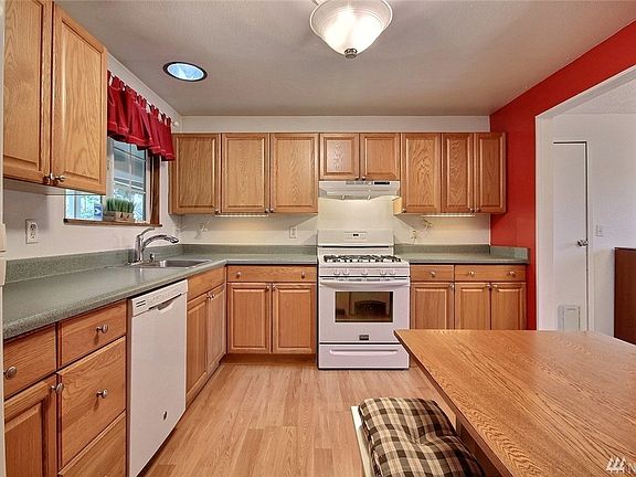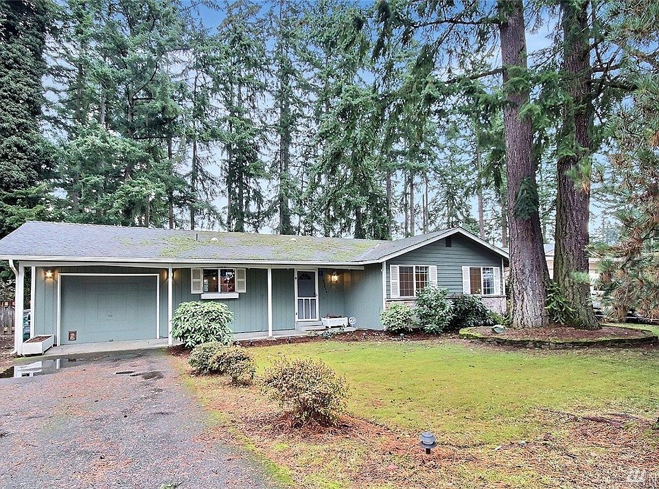 Light & bright one-level living in quiet Federal Way neighborhood. Beautiful kitchen w/gas range & table for 8+! Spacious living/family/dining room w/high quality gas fireplace for year round comfort. 3 generous bedrooms w/double closet in master + continental bathroom. Garage w/workbench. Entertainment sized deck + patio & private, level, backyard w/garden shed & treehouse. Many updates. Abundant parking & across the street from peaceful community park. Move-in ready & truly a must see!
