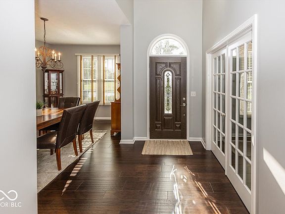 Experience luxury living in this large custom built 4 bedroom 3.5 bath home located in SW corner of Clay Township (convenient to 465/Indianapolis). Enjoy the finished basement with impressive wet bar and room for ping pong table and a separate television area, also equipped with a full bath and enclosed room for crafts/office/flex! The interior boasts a main floor with flex room for office/music/den featuring french doors, a dramatic two story great room with shelving and fireplace, large breakfast area and kitchen open to great room. All appliances are included (even the washer and dryer!) The impressive ensuite has a large walk in closet and beautiful bath area. A glass enclosed sunroom off kitchen and attached deck is yours to enjoy year round while experiencing the large, private lot with numerous trees. and wildlife. The community is a safe community to walk pets and ride bikes. There are community amenities including pool, tennis, pickleball, basketball and playground to keep the whole family active! This is a golf course community but membership is extra. Convenient to excellent schools, restaurants, shopping, and hospitals. Smoke free pet free home