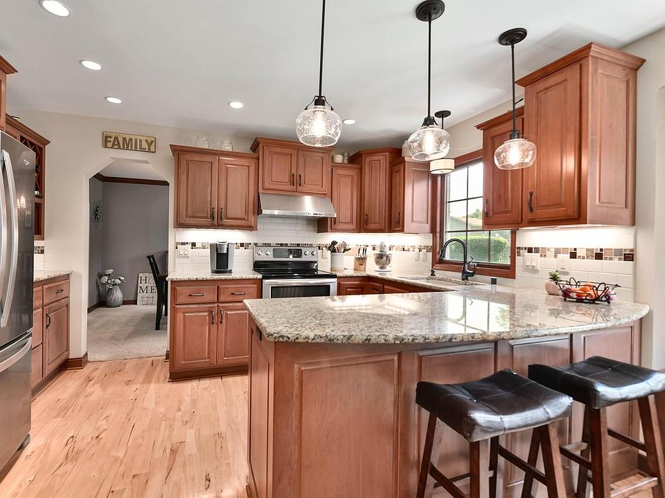 This 4 bedroom 2.5 bathroom home has over 2100 sq ft of living space & is located in the desirable Greenridge West subdivision. Stunning EIK features SS appliances, granite counter tops, pantry, abundant cherry cabinets & breakfast bar. Family room with NFP. Formal dining room has crown molding. Newer hickory flooring throughout. Both bathrooms recently updated. Primary has tiled WIS, new flooring & fixtures. Recently remodeled lower level Rec room is perfect for additional living space. Enjoy the summer nights in the fenced back yard with private patio. See list of seller updates online.