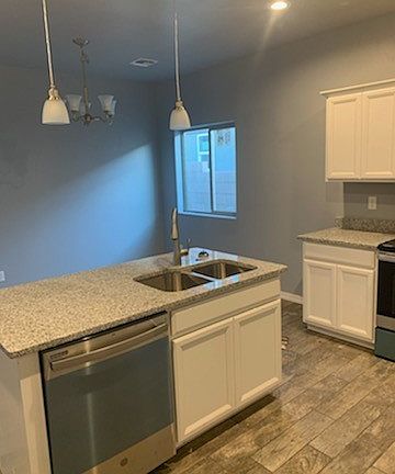 Picture of house is completed model of house that is under construction. Brand new construction with 2X 6 construction, 3 bedroom, 2 bathroom and 2 car garage. Open floor plan. Stainless steel appliances includes, microwave, oven/range, garbage disposal and dishwasher. Kitchen island and pantry and solid wood cabinetry through out the house. Granite countertops and tile floors and showers. Covered patio and landscaped front yard with timed sprinkler system, block wall and wrought iron gates. Room for RV parking. Ceiling fans in living room and bedrooms and coffered ceiling in living room. Agent /Owner