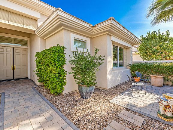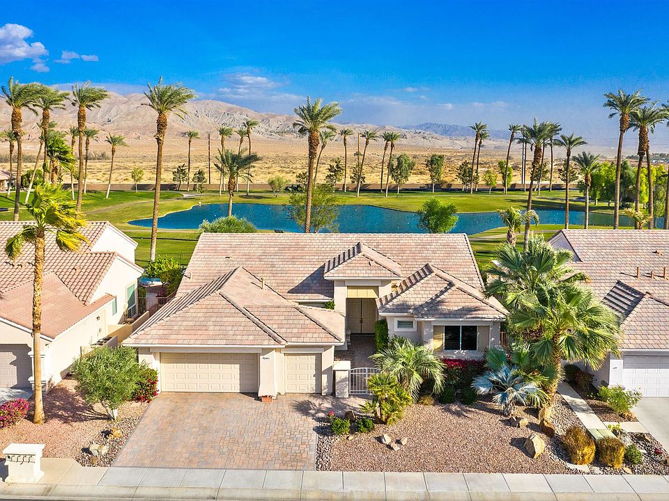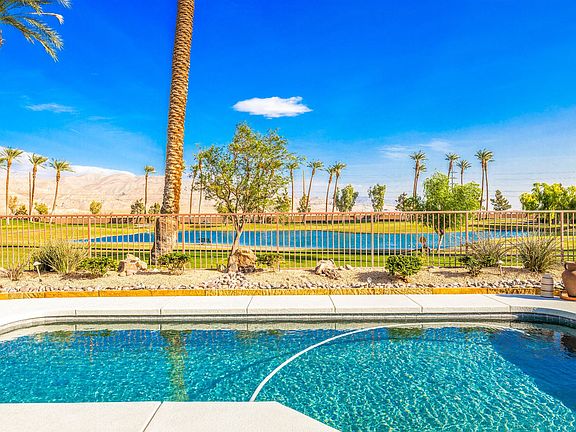55+ Sun City Palm Desert. Most desirable 3 bedroom/3 bath MONACO model in ideal location on the greenbelt and Donny Lake facing east with beautiful sunrise and unobstructed mountain views. Stunning curb appeal with new pavers in front courtyard and driveway. Inside, Plantation shutters t/o, 18 inch tile t/o except one bedroom. Recessed lights and new fans t/o, newer desert-toned paint. Kitchen has updated quartz counters with waterfall edge, tile backsplash, stainless appliances, recessed lighting, skylight. Family room has built-in entertainment center. Living room and Dining area has a wall of windows to the view of the patio and lake. Master bedroom features a sliding door out to the patio and full length window. Bath has granite slab counters, soaking tub and shower with frameless doors, painted cabinets. First guest bedroom has a view of the front and bath has granite slab counter and soaking tub. Second guest bedroom has a built-in 2-person office desk. Laundry room is off the kitchen and includes a washer and dryer. GORGEOUS patio with Salt-water pebble-tec POOL and NEW Cool Deck overlay, brand new irrigation system t/o, built-in BBQ and wrought iron fencing with gate with access to the greenbelt/lake and walking path. Garage is extended with sink and shelving. Water heater with recirculation. Golf Cart included (As Is--needs batteries) Furniture is negotiable outside of escrow.