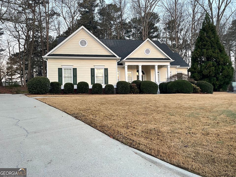 Beautiful ranch with front porch on cul-de-sac lot with very private backyard that is meticulously landscaped. This home has four bedrooms one is currently being used as a office/den. Home has split bedroom plan and one large bedroom upstairs with private bath and sitting area. Each bedroom has its own full bath. Lots of entertaining space: large family room, sunroom, separate den, also room for an office or a formal living room (currently used as music room). Home has custom sitters throughout home. Large sunroom goes out onto a brick patio. Large backyard backs up to a fenced in horse farm. This home has step less entry way and wide hallways, one floor living.