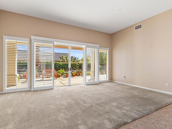 Del Webb - Sun City Palm Desert. Discover the highly sought-after Monaco floor plan, featuring two primary suites and two-and-a-half bathrooms--ideal for embracing the relaxed desert resort lifestyle. Enter through a gated courtyard and decorative glass double doors into the expansive living room, where wall-to-wall windows and sliding doors showcase serene views and provide seamless access to the back patio and yard. With the exception of the living room, the home is tiled throughout. A formal dining room adjoins the main living space, while the kitchen impresses with granite counters, a large prep island with breakfast bar, gas cooktop, double ovens, and ample cabinetry--all framed by a picture window overlooking the tranquil backyard. The kitchen flows effortlessly into the family room and breakfast nook, both offering direct patio access. The primary suite serves as a spacious private retreat, complete with a bay-window sitting area with sliding door, soaking tub, separate shower, walk-in closet, and dual sinks with a convenient sit-down vanity. The extended guest en-suite features its own full bathroom and private entrance from the gated courtyard--perfect for visitors or extended stays or a second primary bedroom suite. A well-equipped laundry room includes a utility sink, folding counter, and ample storage cabinetry. The two-car plus golf cart garage offers additional storage options. Enjoy the lushly landscaped backyard, thoughtfully designed for privacy and low maintenance. Special highlights include an extended patio with alumawood overhang, a babbling brook water feature, and shutters on nearly all windows and sliders. One A/C unit was replaced approximately two years ago.
