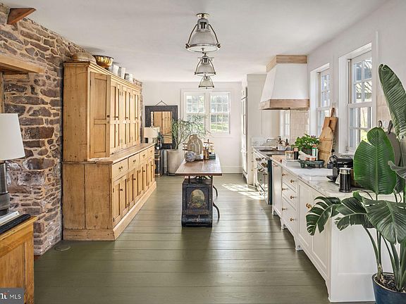 At its heart a simple log cabin built more than 300 years ago, this historical haven overlooking the Paunacussing Creek was expanded with stone and frame additions over the centuries to become a comfortable, character-filled residence. With wide-plank wood floors, exposed-beam ceilings and fireplaces galore, this home exudes warmth as only historical houses can. Once the home of noted artist and illustrator Charles Hargens, the property and its setting inspires decades later. The updates over the years have been well planned and executed. The kitchen is awash in natural light, outfitted with a serious European range, built-in Sub-Zero, furniture-finish cabinetry and a casual dining area lined in windows. Exposed stone walls and an open-beam ceiling add to the room’s appeal. Just beyond is a sitting room where a substantial walk-in fireplace serves as a focal point. The cherry and oak log section, circa 1690 and quite possibly the oldest structure in Carversville area, is now a dramatic, stunning bedroom with vaulted ceiling and fireplace. A sitting room with tile fireplace is adjacent. Each of the guest bedrooms has unique appeal with built-ins and nooks and crannies. Updated, neutral bathrooms serve all bedrooms. A studio/garage building has approved plans for conversion to guest quarters. Outdoor spaces are ready for summer, including a patio and loggia as well as an outdoor fireplace and expansive, level space for croquet and other play. With easy access to New Hope, Lambertville and Doylestown, the property represents the lifestyle so many people come to Bucks County to enjoy. Just a short walk from the heart of Carversville village; 75 miles from New York City and 45 miles from Philadelphia, plus convenient to Princeton and New Jersey’s Route 202 corridor.