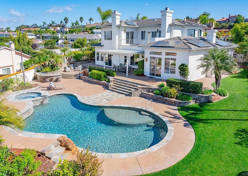 Panoramic Ocean View. Click on 'Tour' for video. You will want to fly into town to see this one!! The dramatic entry into this beautiful and spacious home starts with the tall glass and wrought iron French doors that look straight through past the living room to the Pacific Ocean. Downstairs has soring ceilings, primary suite with dual sided fireplace for the bedroom and large tub in ensuite, large custom walk-in closet, recently updated kitchen with gorgeous appliances and marble counters and flooring that is open to the family room with fireplace, laundry room, guest bathroom, living room with fireplace and hardwood flooring and elegant dining room. The upstairs has 3 bedrooms (2 w/ensuite), office with ocean view, hall bathroom, 2nd family room with large balcony for more ocean view time. Enjoy outdoor living with fruit trees, large backyard patio spaces for dining, gathering around the fireplace, sunning by the salt water pool or hanging out with your grill master around the built-in gas grill. The home has a whole house water filter, paid solar for house in addition to the discreetly hidden paid solar panels for the pool. You will love this cul-de-sac with custom homes and just blocks from elementary, middle and high schools with easy exit access away from the busy school drop times.