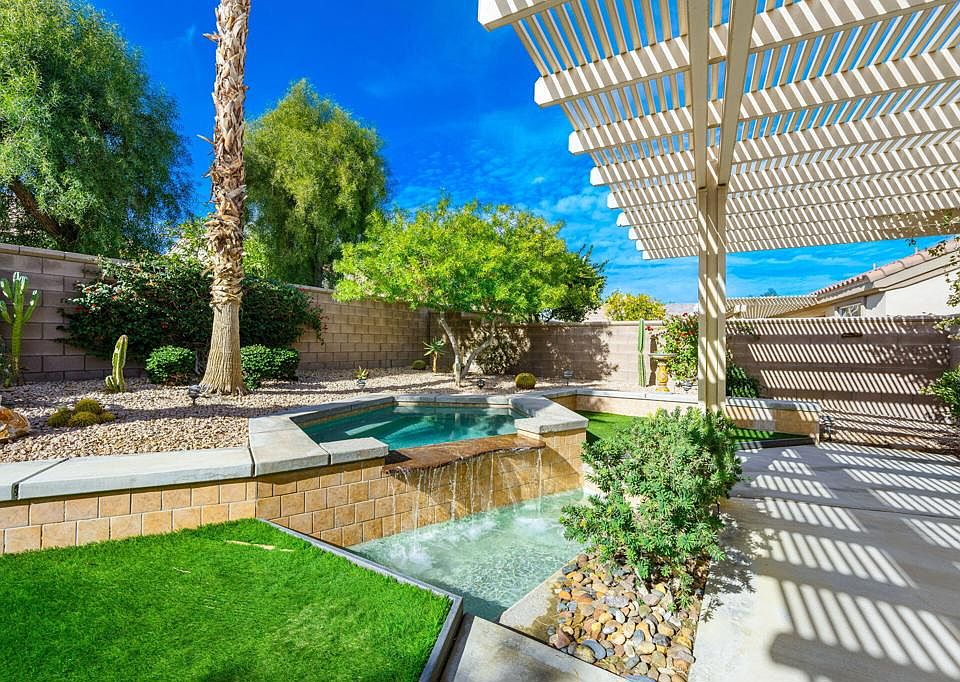 NEW PRICE! Private Spa home in 55+ Sun City Palm Desert! This Montego model is conveniently located between the Sunset Clubhouse & Lakeview Clubhouse. Popular open floor plan - 1865 sqft, 2 bedrooms + Den/office & 2 bathrooms. The back patio & yard is a serene oasis! Featuring a beautiful private spa with waterfall feature & an Alumawood awning that extends across the patio - great outdoor living/dining areas. Living/dining area opens out to back patio & is highlighted by plantation shutters & gas fireplace. Neutral tile flooring throughout, with brand new carpet in bedrooms. Kitchen is open to great room & has countertop bar, breakfast nook, Corian countertops & gas cooktop. Master suite has private access to the patio/spa area. Master ensuite bathroom has dual vanity, large shower & walk-in closet. The Guest bedroom and den/office are on the opposite side of the home and share a Jack and Jill bathroom. Individual laundry room w/ sink. 2-car attached garage. HOA monthly dues include: security gates/patrol, cable TV/internet, exterior pest control, trash & access to community pools, fitness, tennis/pickleball & Clubhouses (golf packages available for additional fee). Sun City Palm Desert is a guard-gated resort community offering a great variety of amenities & activities. Tennis & pickle ball courts, two 18-hole golf courses, driving range, an 18-hole putting course, 2 dog parks & 3 large clubhouses provide many opportunities for fitness, dining, recreation & entertainment