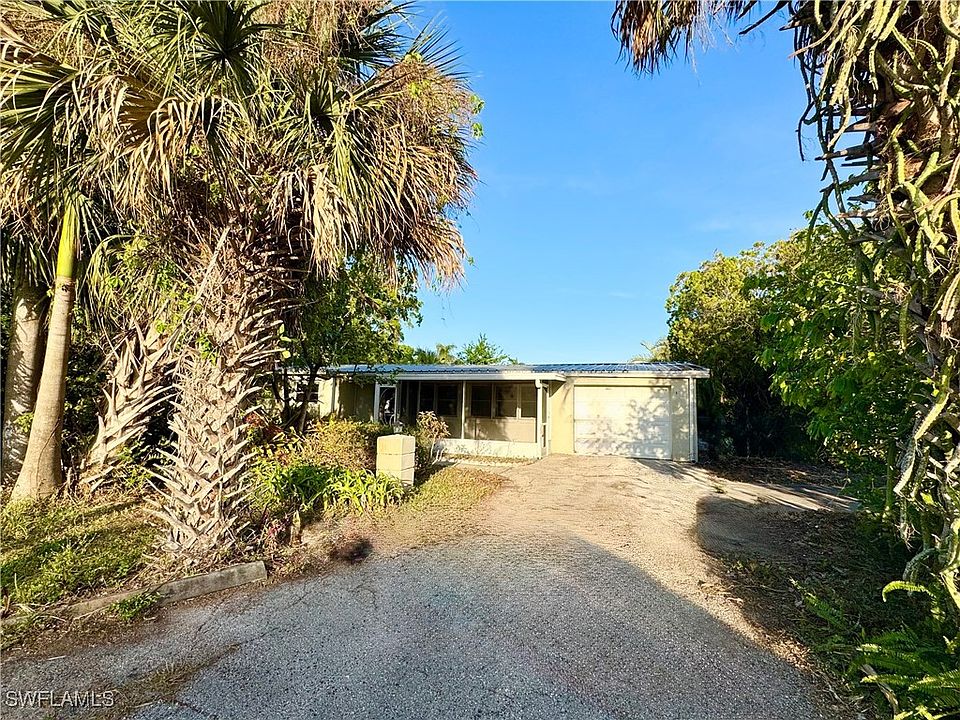 Surrounded by lush landscaping and nestled in a quiet but easy commute neighborhood, this classic home is fully fenced and even comes with a one car garage. Top of the list for peace of mind are the metal roof, electric storm shutters and concrete block construction. NEW PAINT Inside, this home has original terrazzo floors throughout, a spacious living area, and a large extra room that could be a master, or a separate guest suite with it's own private entrance. Quality wooden Kraftmaid cabinets line the kitchen, along with plenty of options to easily make this space your own. There is a screened lanai to the front, where you can spend lazy mornings drinking your coffee and watching the birds in the private tree lined yard. Or watch the sunrise from your back porch. Pick fruit from the various trees as you meander along the professionally installed paved path. This home also comes with its own laundry room and workshop area, with access into the spacious garage. Fort Myers River district is just a short drive away, as well as the countryside, or Interstate 75 - truly a well placed property for any activity.