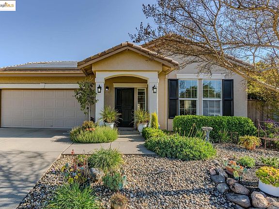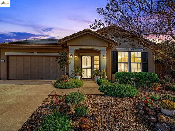 THIS PROPERTY QUALIFIES FOR 100 PERCENT FINANCING WITH PREFERRED LENDER! Immaculate single-story home in the Castle Oaks Golf Community with owned solar! This beautifully maintained home blends comfort, efficiency, and style, featuring fully owned solar panels and a paid-off Mello Roos bond for peace of mind and low utility bills. Step inside to discover an open-concept kitchen and great room, perfect for everyday living and entertaining. The spacious family room includes a cozy fireplace and opens to the back patio. The kitchen boasts a breakfast bar, updated appliances, and plenty of counter and cabinet space. A separate formal living and dining area offers added elegance. The soft, neutral interior palette enhances the airy, welcoming feel. The spacious primary suite is a retreat, with a luxurious soaking tub, separate shower, and custom walk-in closet built-ins. Enjoy mornings or unwind at night on the private patio, just steps from the spa. The beautifully landscaped backyard features a slate patio, tranquil fountain, spa, and two newer sheds for extra storage. With thoughtful upgrades throughout, this turn-key home in the sought-after Castle Oaks Golf Community is move-in ready!