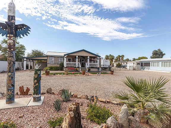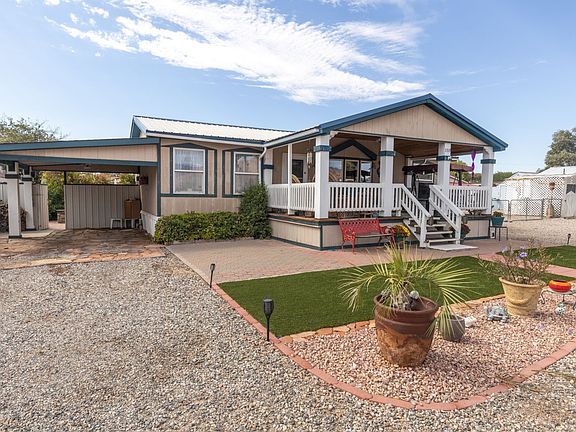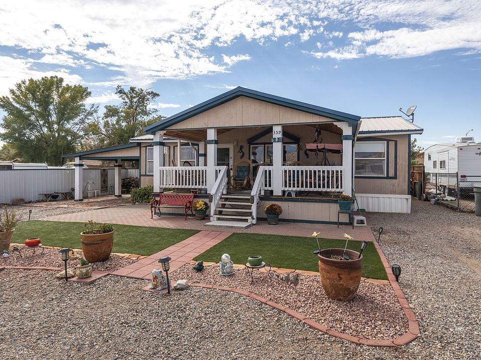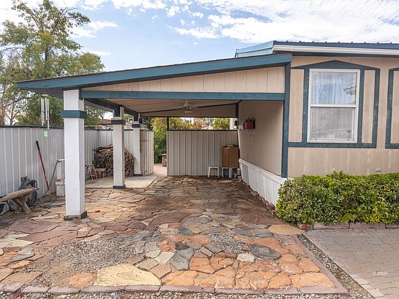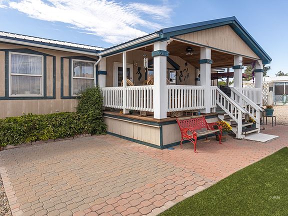 Pride of ownership shines through on this 1,080 sf manufactured home. Built in 1996, the addition of a beautiful full porch gives this home a cozy cottage look. The main bedroom and bath are located on the left end of the home separate from a second bedroom, bath and den on the right end of the home. Kitchen has laminate plank flooring, lots of cabinets and plenty of counter space. Owners have added a covered carport, an open-air brick patio with fire pit and a semi closed workbench area in the rear of the home. A must see! Mesquite, Nevada has several championship golf courses, live action casinos and is only 78 miles from Las Vegas and 35 miles from St. George, Utah.