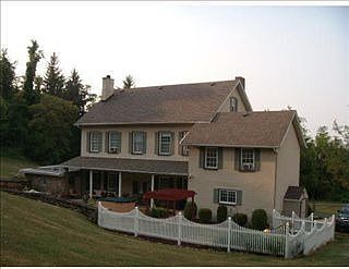 A beautiful, well maintained brick home nestled in a unique country setting only a few miles from connecting highways to Pittsburgh, Greensburg, Washington and Morgantown, WV. This property affords privacy with accessibility to shopping, commuting and daily activities for the whole family. Updated roofing, windows, plumbing and electrical service makes this house move in condition. The exterior recently received a coat of Sherman Williams paint. Ideal for entertaining is the patio area in the back of the house with beautiful views of the seasonal foliage. Step onto the 50' front porch and though the custom made front door that welcomes you into the three story foyer with original wood work and mahognay handrail. A large family room with Casablanca ceiling fans, cedar ceiling beams, a stone fireplace with raised hearth and a buck stove insert with variable fan speeds provides a cozy winter retreat. First floor formal dining room and sitting room with tray ceilings and detailed original wood work are perfect for entertaining. The eat in kitchen comes with stainless steel appliances, a butcher block island, Wood Mode cabinetry with seeded glass inserts and glass shelving highlighted with in cabinet lighting. Next to the kitchen is a laundry room/pantry with built in storage and folding area. Off this area is back stairway to two of the the 4 bedrooms and one of the full baths. Some special features of this large home are a home security system with video monitored surveillance, whole house vacuum system and and intercom system. A large master suite has a newly remodeled bath, Casablanca ceiling fans, high tray ceilings, walk in closets and abundant light from four large windows with views of the mountains. Beautifully decorated upstairs bathrooms have updated Kohler and Moen fixtures also a half bath on the first floor is updated with a pedestal sink and ceramic flooring. You will find the attic has 2" insulation board on the floor and offers plenty of walk in storage area. The heating system is hot water baseboard keeping the house warm and cozy for maximum comfort. The two car attached tandem garage with paved driveway and alert system for approching vehicles is very convenient. A small gardening shed is attached to the east side of the house. A 30' x 50' detached out building with electricity and and 8' high electric garage door offers possibilities for storage or could be used as a barn. This property is one of a kind and offers a retreat syle of living you will only find in county settting as gracious as this home. Additional property info: http://www.forsalebyowner.com/listing/2D1I8?provider_id=28079