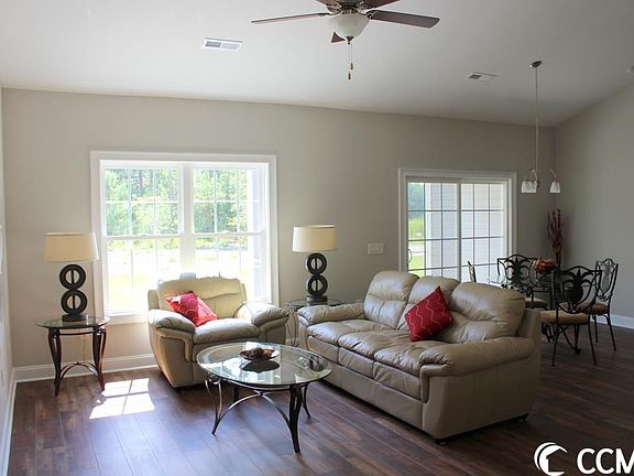 Former Model - never occupied home for sale, available now! Woodland Valley (at Diamondback Golf Course) on Hwy 9, close to Hwy 701. Within 20 minutes of North Myrtle Beach, the ocean, shopping, and dining. Beautiful established community. Popular Hickory plan is an open plan with a relaxing front porch, rear screen porch, and patio. Formal dining room has a tray ceiling, the living room has a vaulted ceiling with a fan and light. Upgraded waterproof, wood-look luxury vinyl plank flooring in the foyer, dining room, living room, hall, breakfast nook, kitchen, and bedroom 3. RCM tile in both bathrooms and laundry room and carpet in the master bedroom and bedroom 2. Bedroom 2 also has a ceiling fan with a light. Large kitchen has lots of solid wood cabinets with crown molding, breakfast bar, granite countertops, stainless steel appliances – microwave, smooth top stove, dishwasher, and pantry closet. Split bedroom floor plan – Master suite has a vaulted ceiling with a fan and light, huge walk-in closet, double bowl sinks in a raised height vanity, soaking tub, and a separate walk-in shower. Guest bedrooms and bath are on the other side of the home. Comes with blinds on windows and slider door to the rear screened porch. Spacious finished/painted 2-car garage with automatic door opener, pull down stairs to attic storage above. Irrigation system, gutters, sodded and landscaped yard. Award winning local builder. Video is of a similar home built elsewhere. Square footage is approximate and not guaranteed. Buyer is responsible for verification.